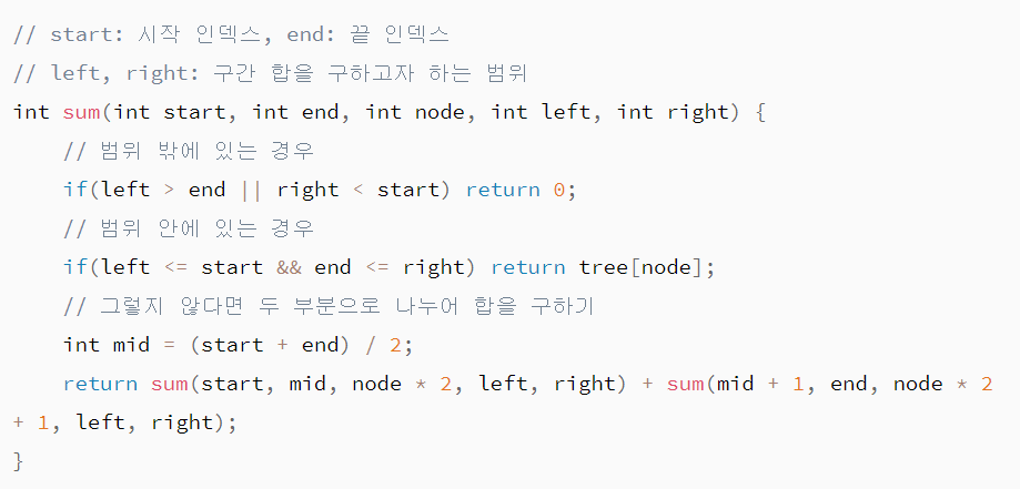 구간합 구하는 함수. 지관적으로 구할려는 i,j에맞게끔 재귀를 분리하였다. 찾아보니 더간결한 소스가 있어서 밑에 첨부.