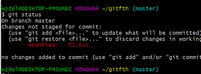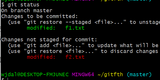 status를 해보면 f2.txt는 아직 변경된 상황으로 status상태로 남아있다.