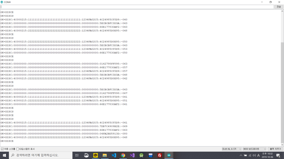 BLE통신의 브로드캐스트모드에서 하나의 ble (hm10)이 마스터슬레이브로서 여러데이터들은 무작위로 수신받는다.