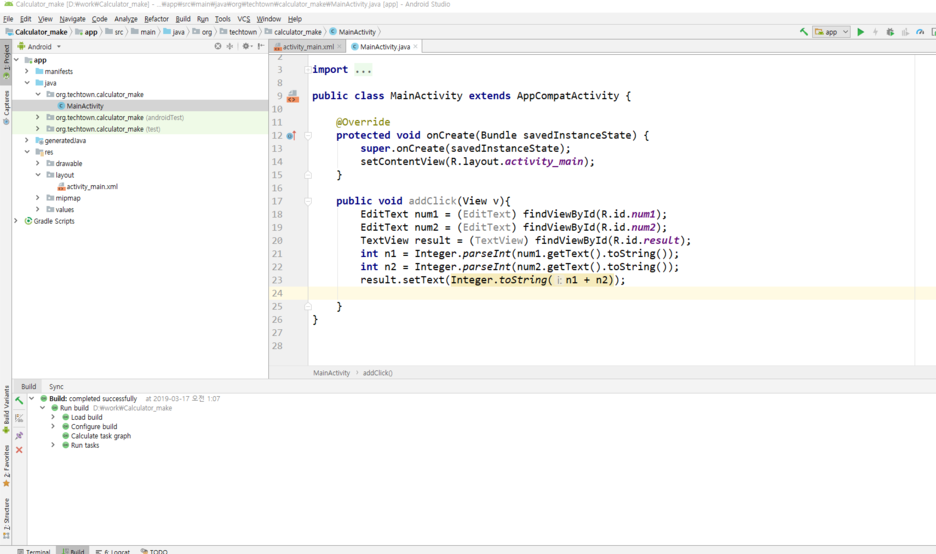 메인 엑티비티로 돌아와서 사칙연산에 대한 함수를 만들어 줍니다.