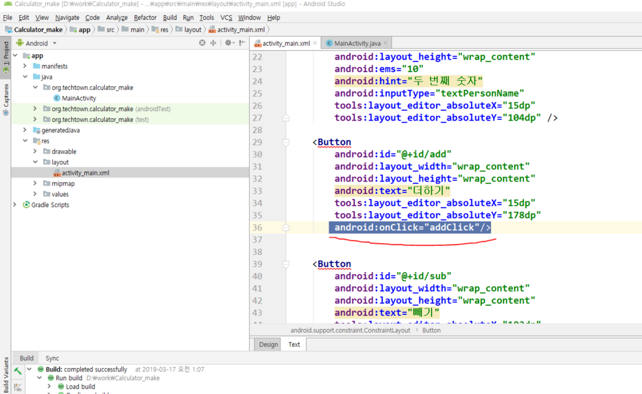 android:onClick="addClick" 을해서 더하기 버튼이 onClick이라는 상태가 되었을 경우