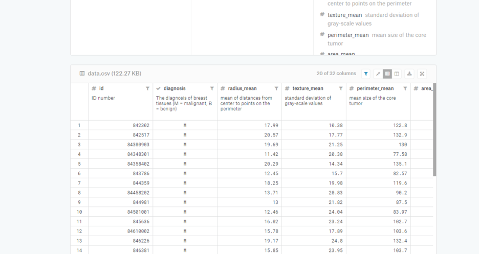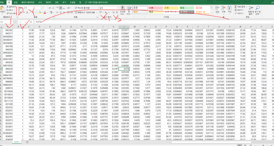 파일형식은 csv 파일 형식이고 M이면 악성 B이면 양성입니다.