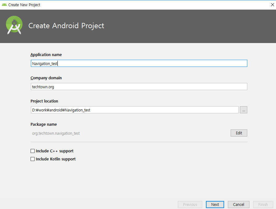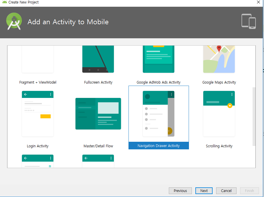 Navigation Drawer Activity를 선택하고 프로젝트를 생성합니다.