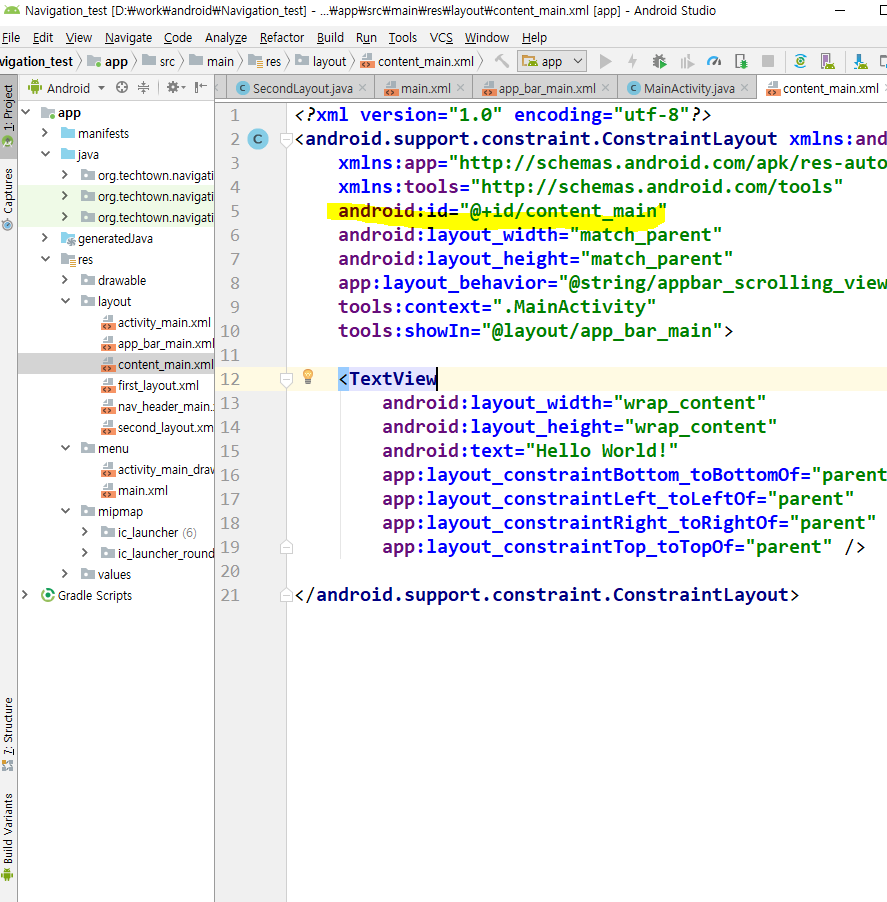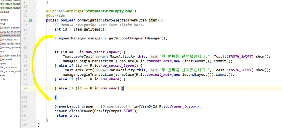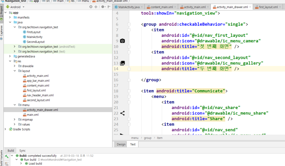 menu에 main_drawer에서 첫번째 레이아웃과 두번째 레이아웃을 맵핑시켜줍니다.