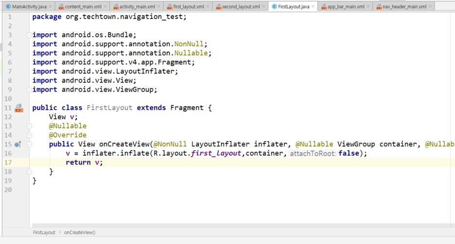 v = inflater.inflate(R.layout.first_layout,container,false); return v;