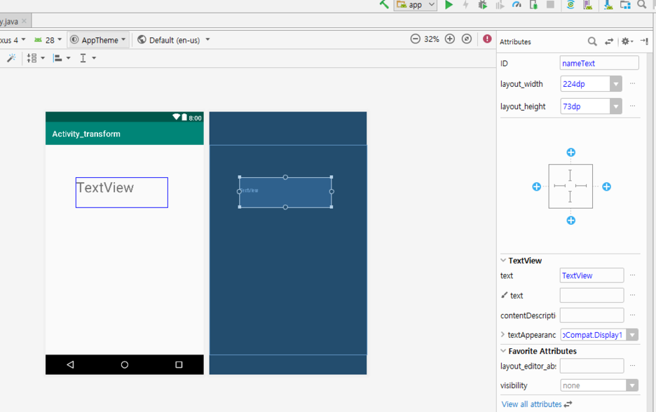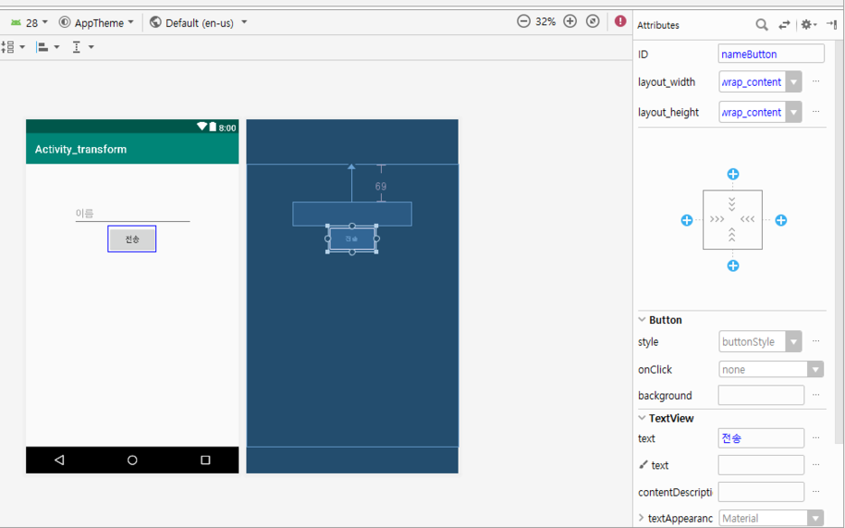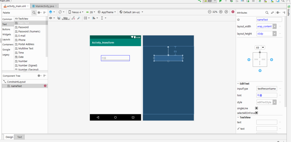 textView를 만들어주고 id를 아까와 마찬가지로 nameText라고 해줍니다.
