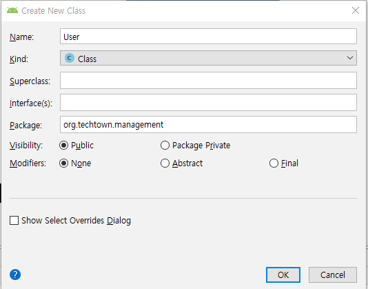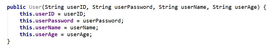 하나의 사용자에 대한 정보를 담을수 있는 User라는 Class를 만들어줍니다.