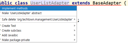 BaseAdapter를 상속받고 붉은 전구 표시를눌러 필요한 메소드들을 자동입력 받습니다.