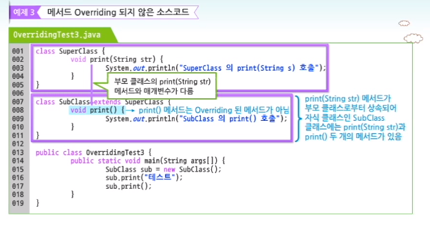 - 상속 관계에 있느 두 개의 클래스에서 부모가 가진 메서드와 동일한 시그니쳐