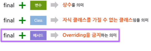 "final 예약어는 변수, 메서드, 클래스 앞에 붙일 수 있는 Modifier"