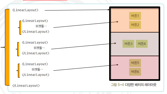 하지만 LinearLayout은 xml언어상에서 순서도 중요하다. 하지만 LinerarLayout에서는 표현하기 어려운 위젯 배치가 많다.