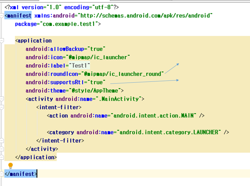 - <intent-filter> 이부분은 프로젝트의 시작점의 권한을 설정할수가 있다. 4개의 컴포넌트 모두가능(액티비티,방송수신자,서비스,콘텐츠제공자)