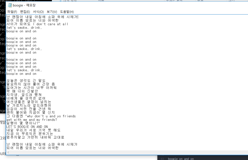 파이썬으로 특정단어를 카운트 해보겠습니다. 먼저 원하는 노래가사를 복사한후 텍스트 파일에 붙여 넣어줍시다.