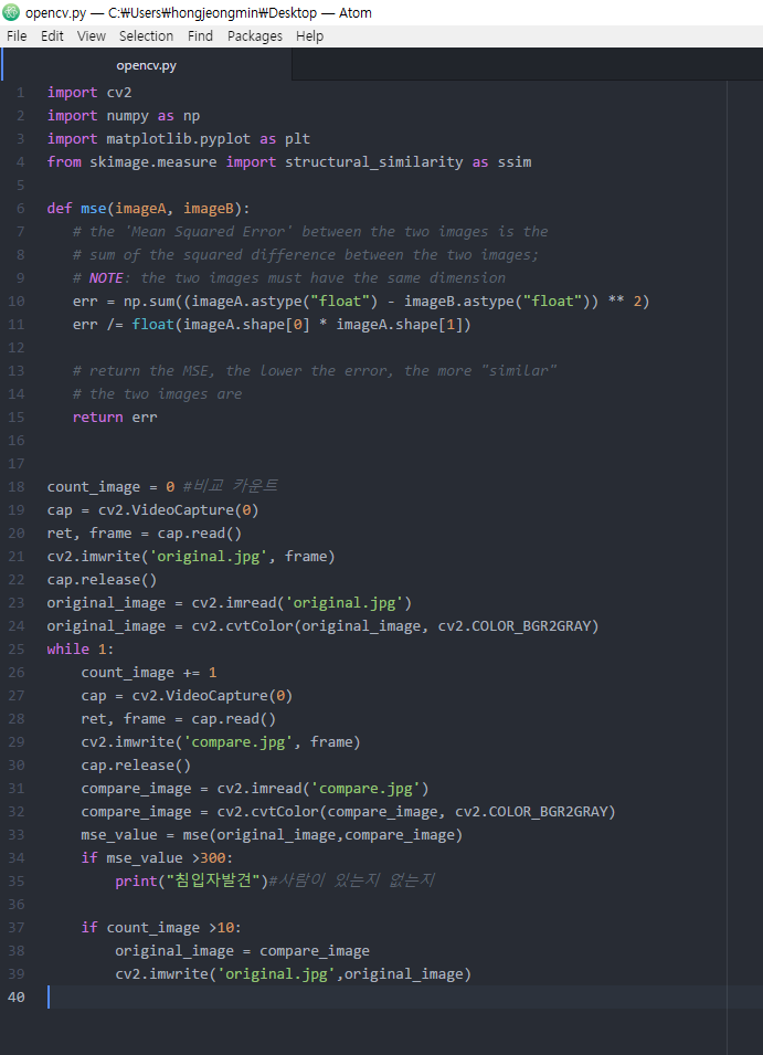 오늘 알려드릴거는 이미지 2개를 비교하는 MSE 라는 함수를 이용해서 현재 카메라앞에 동작이 있는지 없는지를 판단하는 방법입니다.