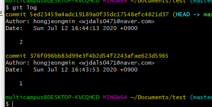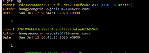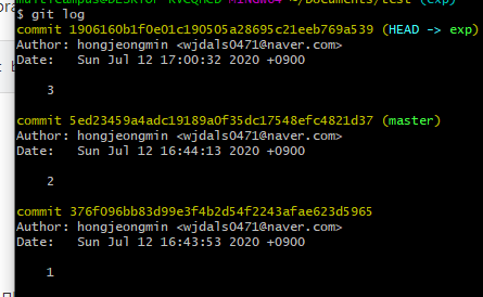 git log 등을 사용해보면 현재 생성한 브랜치는 master == exp 브랜치는 같은 값을 가지고 있다.