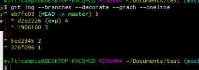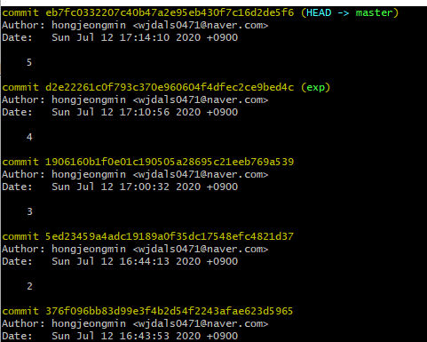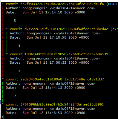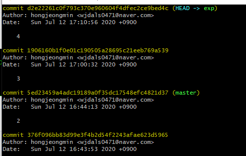 마스터라는 브랜치는 5이전에는 2였고 exp라는 브래치는 3이전에 2이였다는것을 알 수가 있다.
