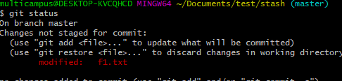 f2를 만들고 다시 stash를 하게되면 stash list에 다음과 같이 나오게되는데 위에 있을수록 최근에 stash한 것이다.