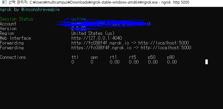그리고 계정을 로그인했다면 Connect your account가 정보가 있다 그것을 복사해서 ngrok실행한 cmd화면에 실행하면