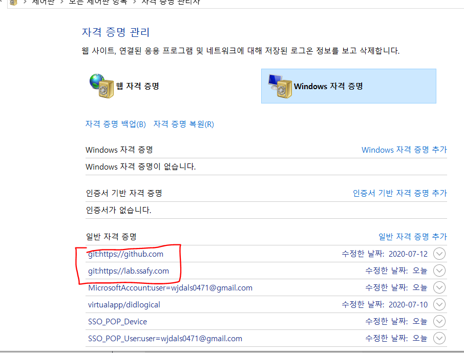 자격 증명 관리를 통해서 id / pw 변경한다.