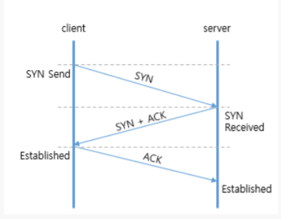 | 1. client에서 server에 접속하는 요청하는 SYN 패킷을 전송 2. server는 SYN 패킷을 수신 후 요청을 수락한다는 ACK와 SYN flag가 설정된 패킷을 전송하고 ACK 응답을 기다림 3. client는 SYN + ACK 패킷을 수신 후 server에 ACK응답을 보냄 |