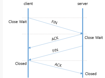 1. client가 연결을 종료하겠다는 FIN을 server에 전송 2. server는 FIN을 받았다는 응답 ACK를 전송 후 통신을 종료 시킴 3. server는 통신이 끝나면 연결이 종료되었다고 client에게 FIN을 전송 4. client는 FIN을 수신하고 수신했다는 응답 ACK를 server에 전송 |