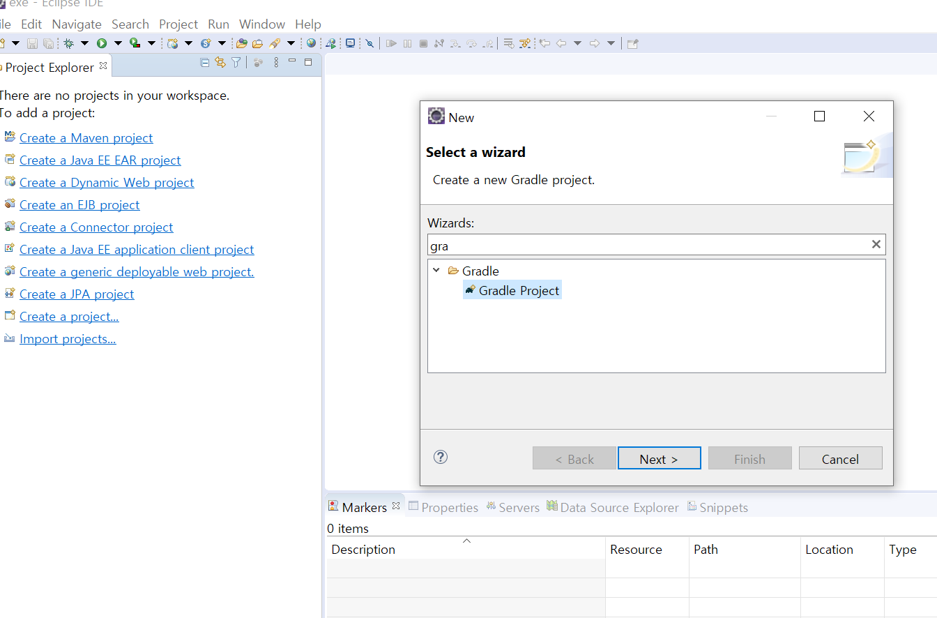 이클립스 기준으로 Gradle을 추가하기 위해서는 file -> new -> other 를 통해서 Gradle Project를 생성해준다.
