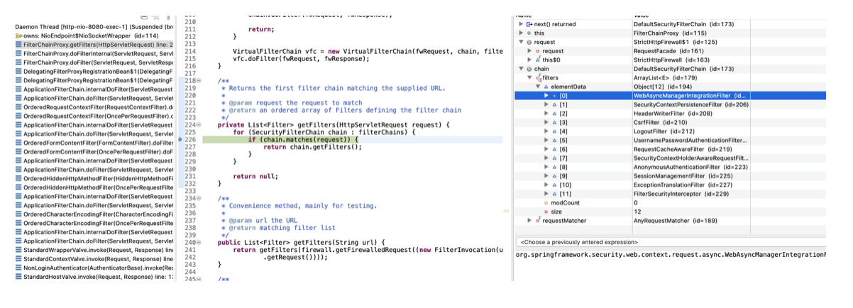 Break Point를 찍고 "/" 경로를 탐색해보니 여러 필터들이 생성된것을 볼 수 있다.