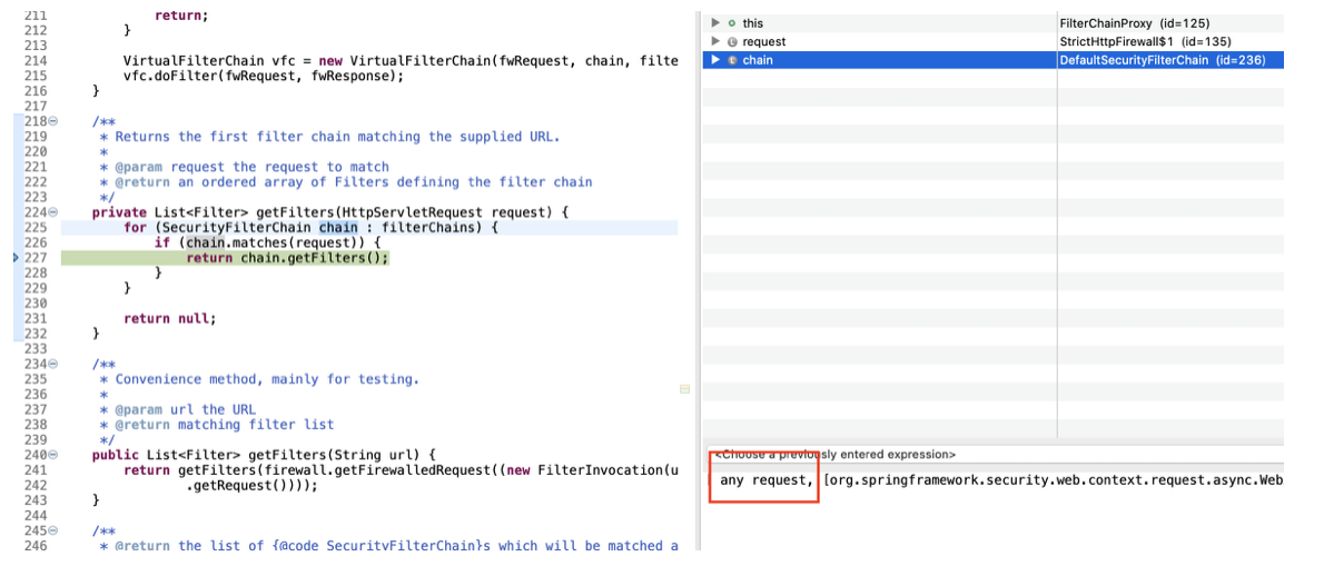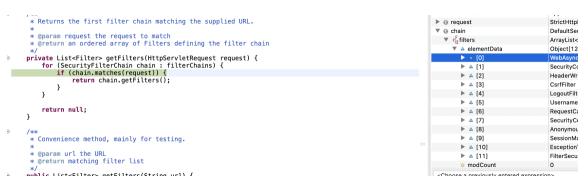 저렇게 내부적으로 for 문을 돌면서 해당 필터체인에 mach가 되면 return을 하게되는 구조다. (null값이면.. 필터에 걸리지 않은것 같다