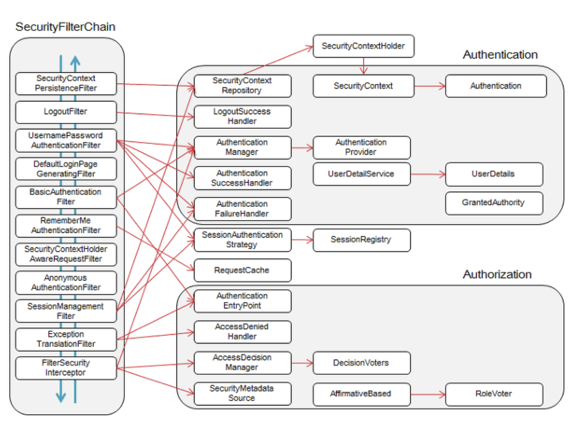 Spring Security는 Spring 기반의 애플리케이션의 보안(인증과 권환, 인가 등)을 담당하는 스프링 하위 프레임워크이다. Spring Security는 '인증'과 '권한'에 대한 부분을 Filter 흐름에 따라 처리하고 있다. Filter는 Dispatcher Servlet으로 가기 전에 적용되므로 가장 먼저 URL 요청을 받지만, Intercepteor는 Dispatcher와 Controller 사이에 위치한다는 점에서 적용 시기의 차이가 있다. Spring Security는 보안과 관련해서 체계적으로 많은 옵션을 제공해주기 때문에 개발자 입장에서는 일일이 보안관련 로직을 작성하지 않아도 된다는 장점이 있다.