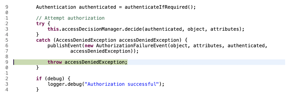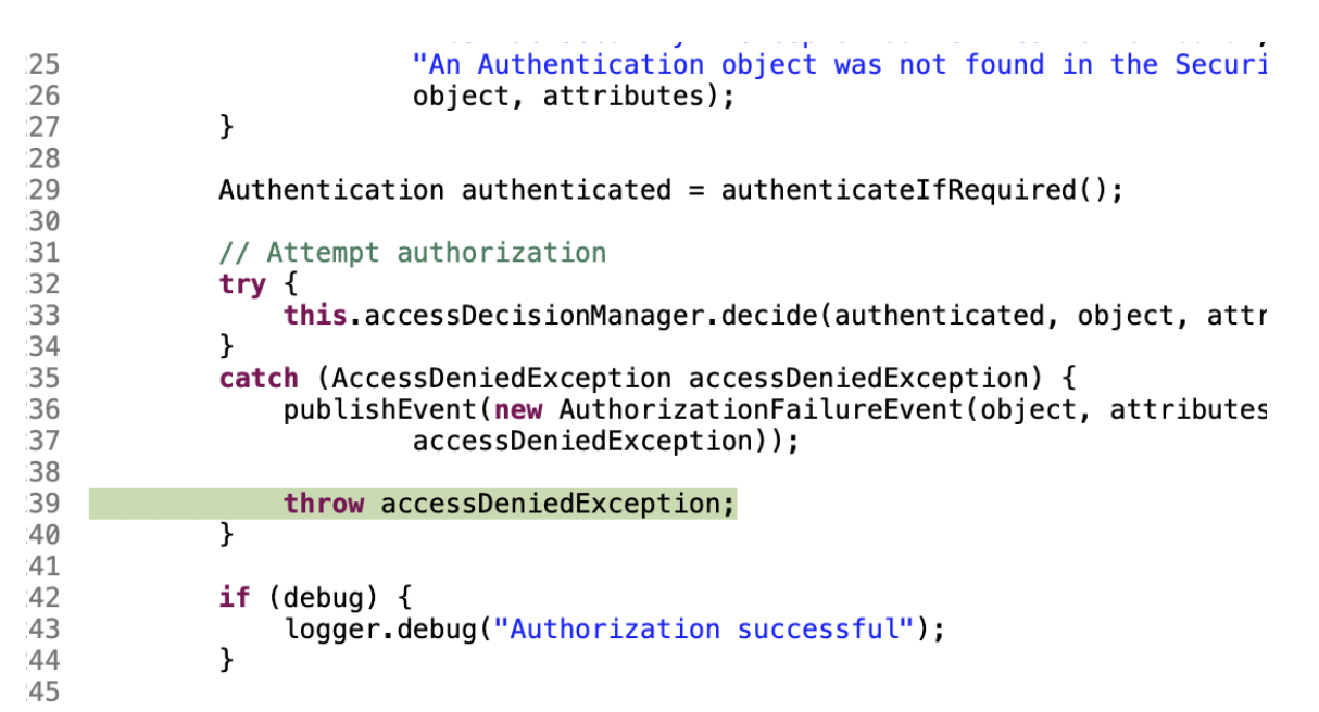 필터들이 돌면서 허가되지 않은 인증에대해서는 accessDecisionManager가 예외처리가 된다.