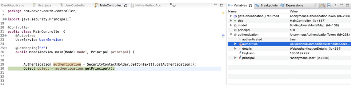인증 후에는 Principal 값이 ROLE_USER 로 바뀌어 있었다..