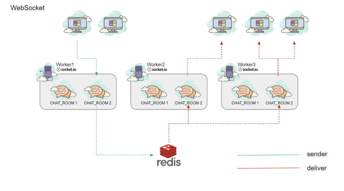 Socket.io의 경우 동이한 서버에 접속한 상태가 아니라면 클라이언트간의 통신이 안되는 경우가 발생하는데 해당 부분을 처리하기 위해서는 Redis의 Pub/Sub 기능을 활용해야한다.