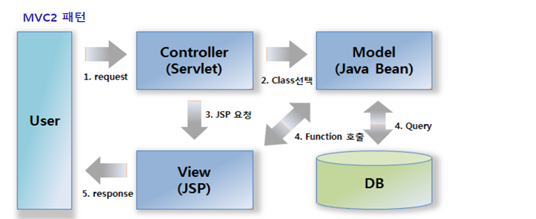 MVC2는 내가아는 MVC패턴과 비슷해보인다. 웹 브라우저에 대한 요청들을 Controller에서 처리하고 화면은 View(JSP)가 담당하는 구조로 개발자와 디자이너의 구분이 확실한 구조이다. MVC2 는 MVC1보다 이해하기 어렵다고하는데..