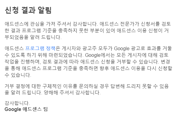 글수를 550개나 넘게 섰고 그전에는 광고목적이 아니라 정말 일기장처럼 공부하내용을 기록하거나 저의 생각들을 적는 블로그였죠. 하지만 애드센스 등록 글들을 보면서 10개도 안되는 글로 등록되는걸 보고 아.. 나는 당연히 애드센스 통과하겠지 했는데 이런 메일이 날라왔습니다.