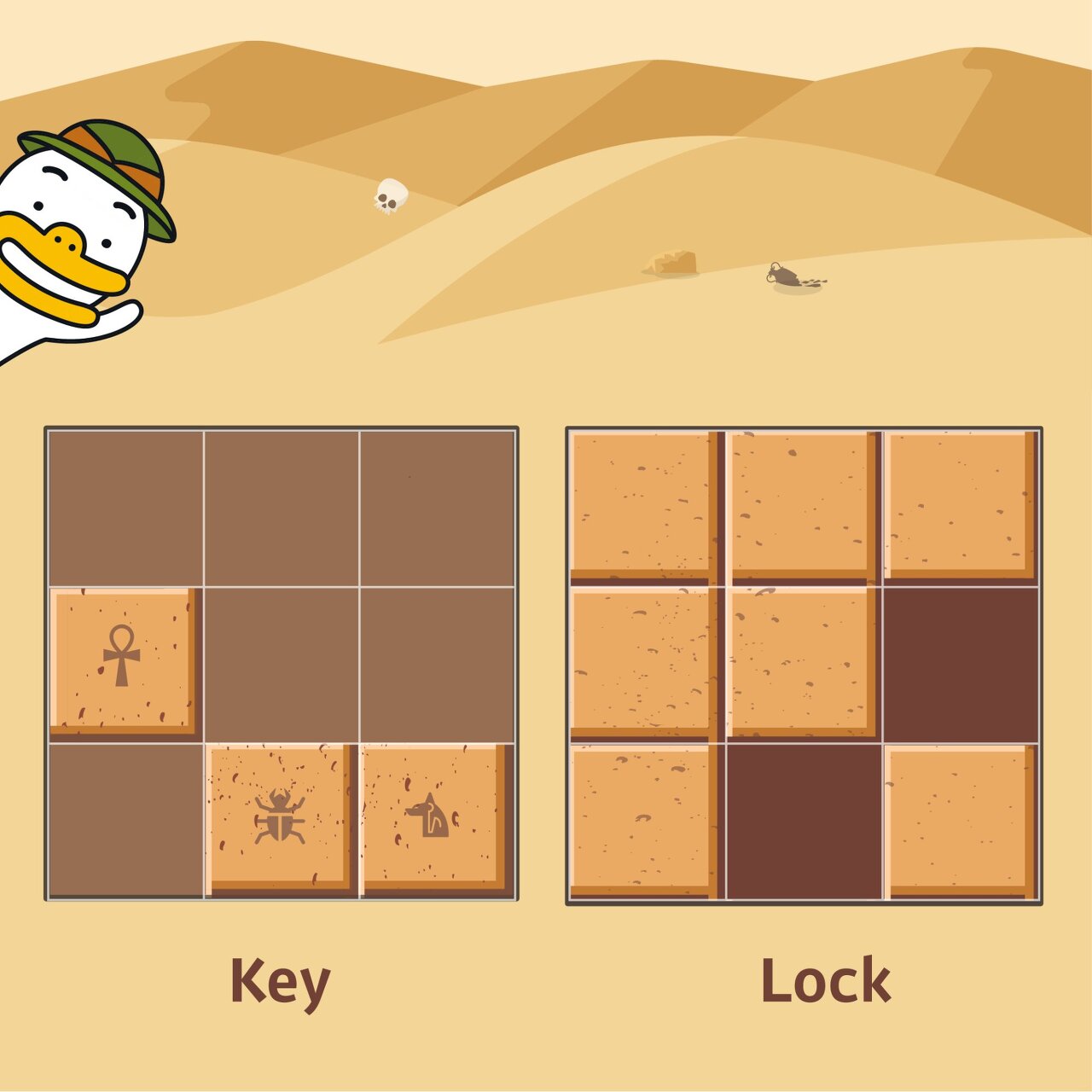 자물쇠에는 홈이 파여 있고 열쇠 또한 홈과 돌기 부분이 있습니다. 열쇠는 회전과 이동이 가능하며 열쇠의 돌기 부분을 자물쇠의 홈 부분에 딱 맞게 채우면 자물쇠가 열리게 되는 구조입니다. 자물쇠 영역을 벗어난 부분에 있는 열쇠의 홈과 돌기는 자물쇠를 여는 데 영향을 주지 않지만, 자물쇠 영역 내에서는 열쇠의 돌기 부분과 자물쇠의 홈 부분이 정확히 일치해야 하며 열쇠의 돌기와 자물쇠의 돌기가 만나서는 안됩니다. 또한 자물쇠의 모든 홈을 채워 비어있는 곳이 없어야 자물쇠를 열 수 있습니다.