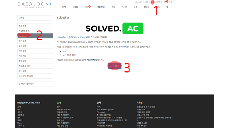 3. 사용하기 버튼을 눌러 solved.ac를 활성화 시킵니다.