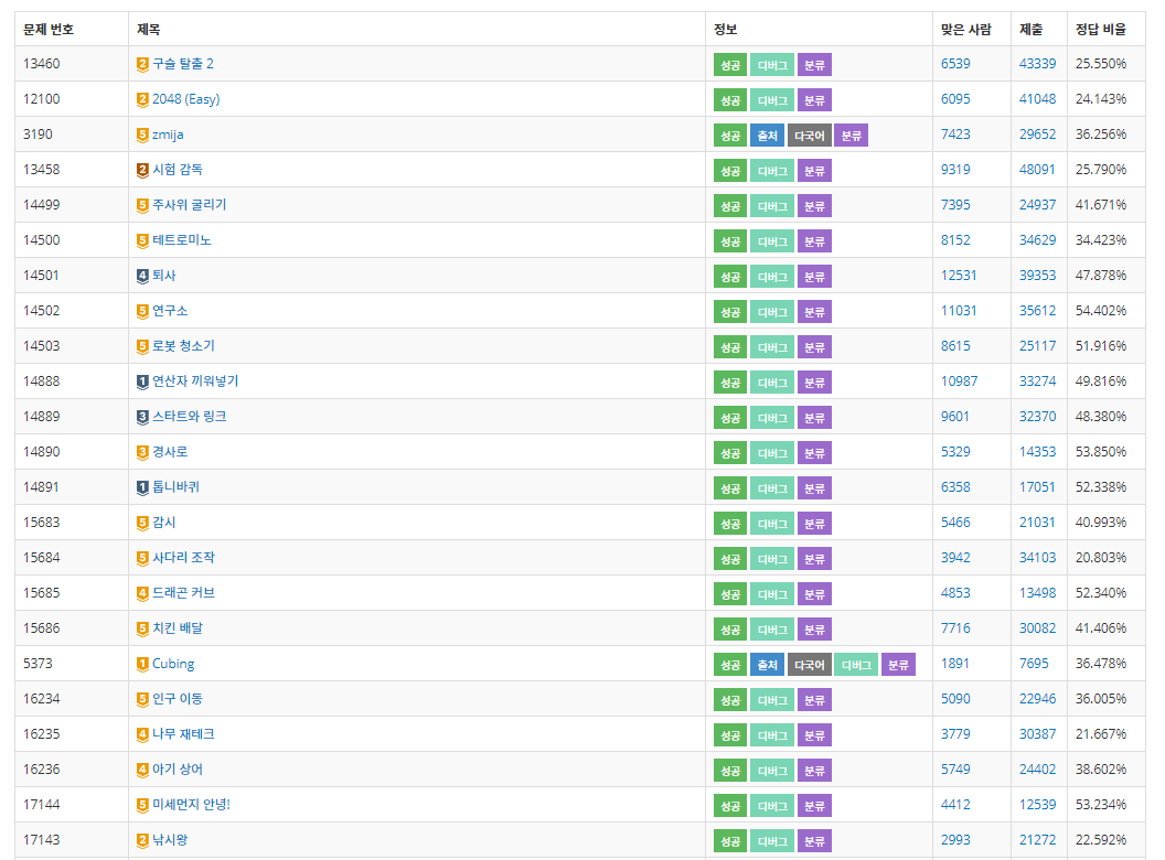 위의 티어를 이용해서 문제의 난이도를 빠르게 확인 할 수 있고 자신의 레벨에 맞는 문제를 고를 수가 있습니다.