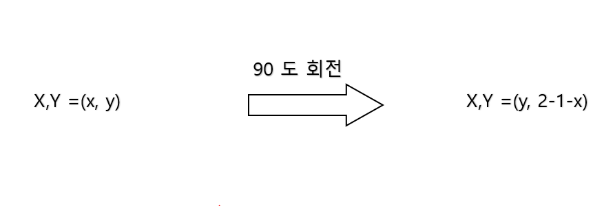 rotate함수는 int[][]를 반환하는 함수이다. 새로운 copyMap을 선언하고 기존 가로 세러 (N,M)크기에 대해서 M,N의 크기로 선언한다. 그리고 다음 그림처럼 식을 이용해서 값을 집어넣어서 배열을 채운후 새로운 copyMap 배열을 반환한다.