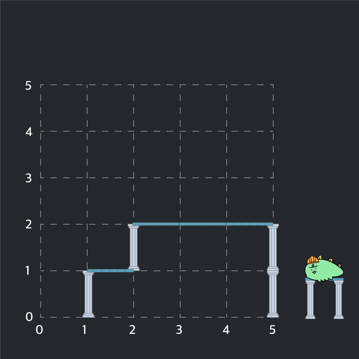 - (5, 0)에서 위쪽으로 기둥을 하나 설치 후, (5, 1)에서 위쪽으로 기둥을 하나 더 설치합니다.