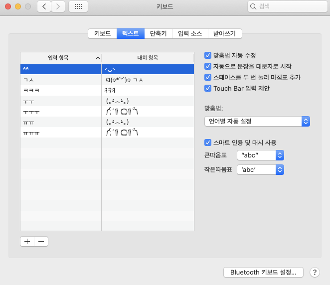 맥북의 키보드 -> 텍스트 로 들어가게 된다면 다으과같이 자주쓰는 단어를 대치항목을 이용해서 변경할 수 있습니다.
