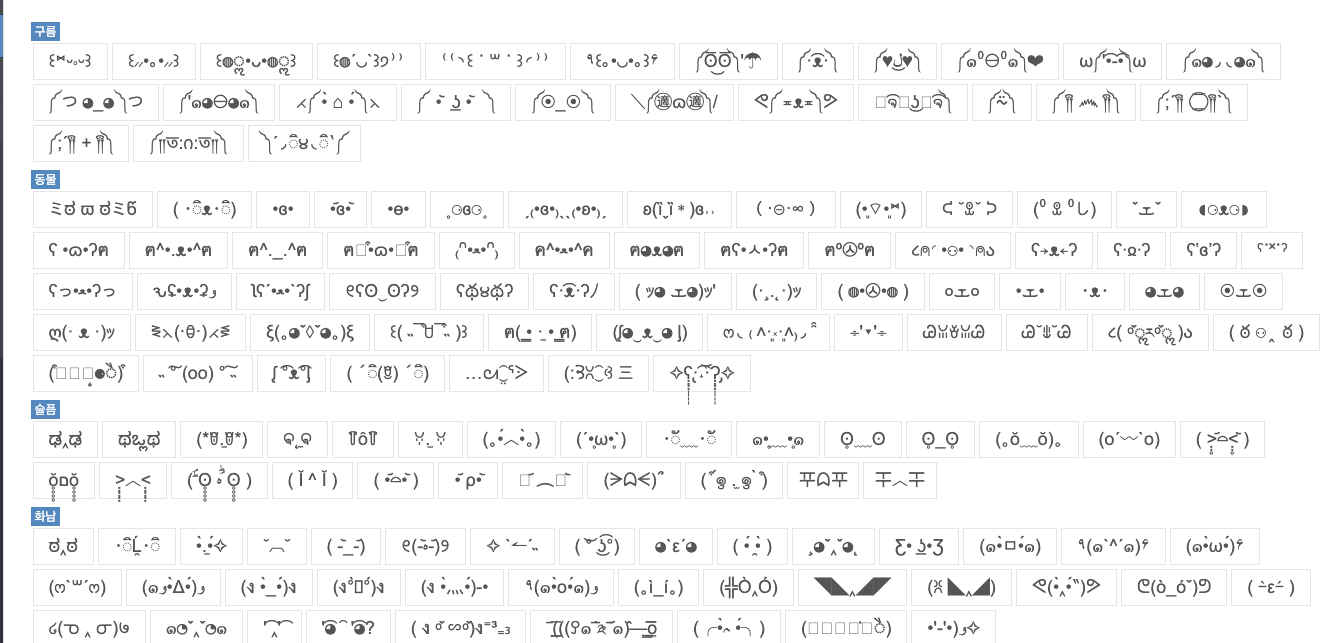 저는 ༼;´༎ຶ ༎ຶ`༽ 이런 이모티콘이나..... ଘ(੭*ˊᵕˋ)੭ 이런이모티콘을 자주씁니다.. (언제부터인지는 모르겠으나 뭔가 다른사람들의 반응이 극혐하는걸 즐기게 되었습니다..)