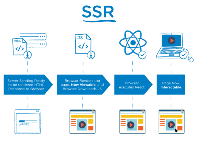 클라이언트 사이드는 빈 HTML파일만 있는게 문제였다. 이러한 문제를 해결하기위해서 과거의 static 사이트처럼 서버에서 필요한 데이터와 HTML구조들을 만들어서 클라이언트 사이드에게 전송하게 합니다. (동적으로 조금 제어할 수 있는 소스코드와 함께) SSR을 이용하게되면 첫 번째 페이지 로딩이 빨라지고 효율적인 SEO를 사용할 수 있습니다. (하지만 블링크 이슈,서버의 과부하가 걸리기 쉽고, TTV TTI의 이슈가 존재합니다.)