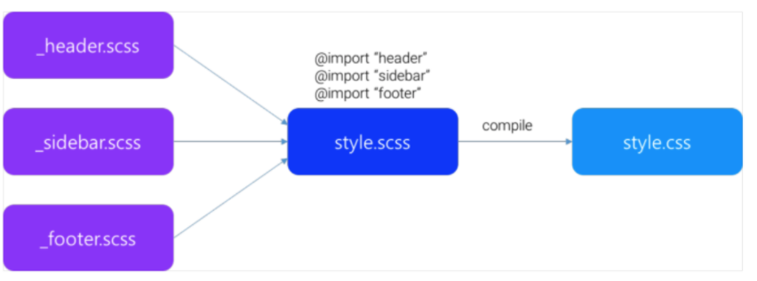 CSS의 @import 구문과 유사한 형태로 사용되지만, 차이점은 Sass에서의 @import는 컴파일 단계에서 파일을 불러와 하나의 CSS로 파일이 합쳐집니다. scss파일을 모듈 또는 레이아웃 기준으로 분리하여 css 구조화를 할수 있습니다.