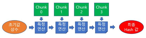 그리고 이러한 chunk 들을 차례대로 순회하면서 특정 연산을 수행하여 최종적인 hash 값을 계산해내게 됩니다.