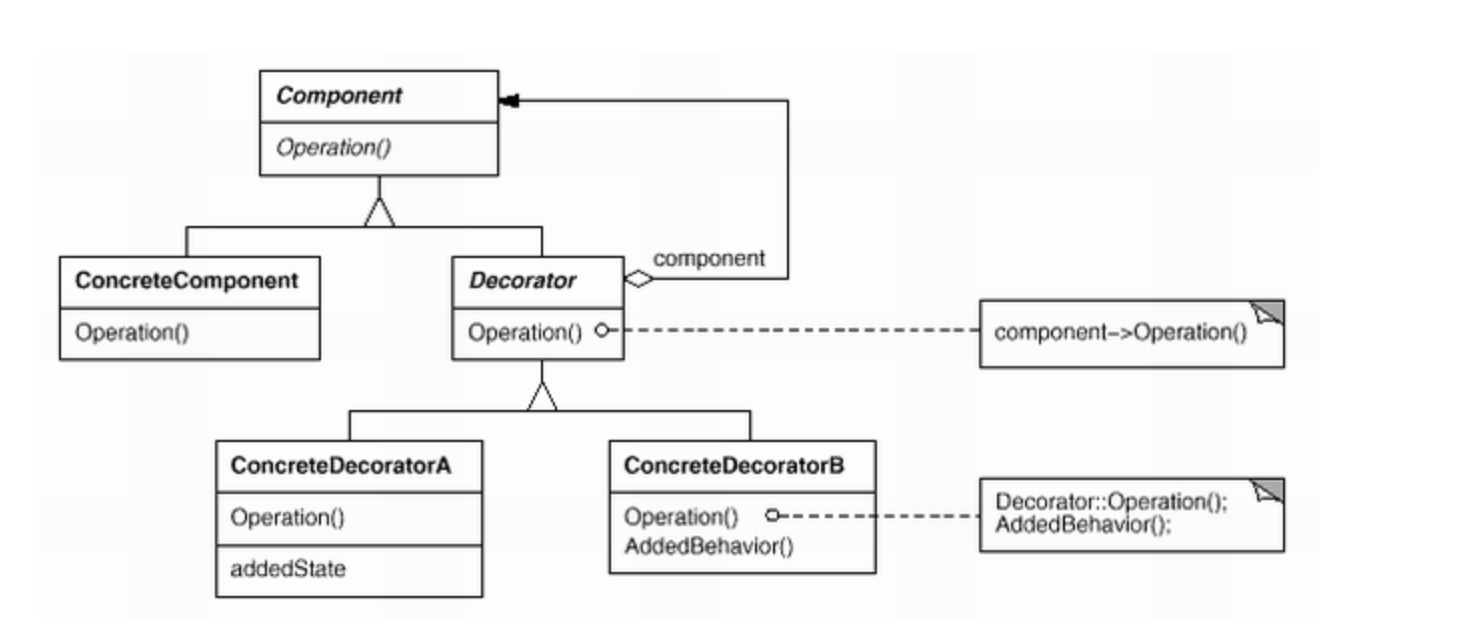 Component란 이름은 이전 프록시 패턴의 Subject인것 같고 특이한점은 바로 Component를 바로 마드는게 아니라 Decorator를 인터페이스로 만들어서 꾸며주는 부분을 영역을 구분한다.