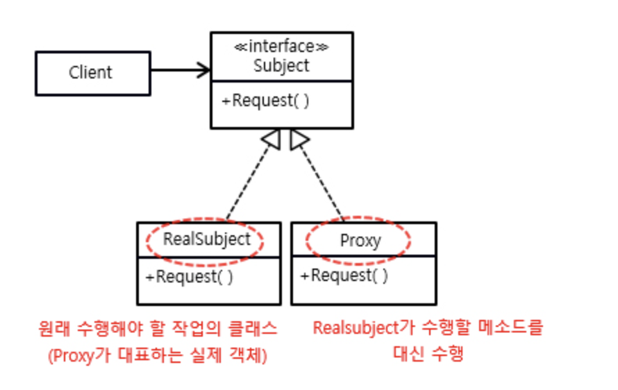 해당 그림도 구글에서 주워 왔는데 RealSubject와 Proxy는 같은 인터페이스의 구현체가 되었고 Proxy는 클라이언트에서 호출하는 RealSubejct와 대체 될 수 있어야한다.