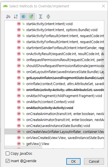 이후 Arlt + Insert를 눌러서 Override Methods를 해줍니다.