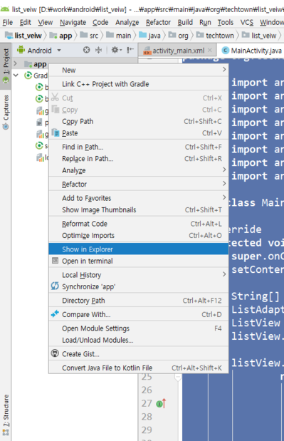 레이아웃에 listview를 추가하고 id를 listView로 변경합니다.