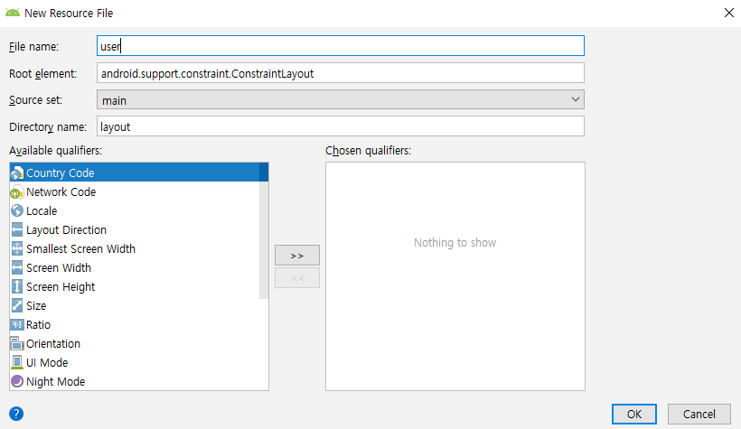 위에 처럼 레이아웃을 꾸미면 이젠 각각의 사용자의 정보를 어떻게 넘겨줄지에 대한 레이아웃을 만들어줍니다.