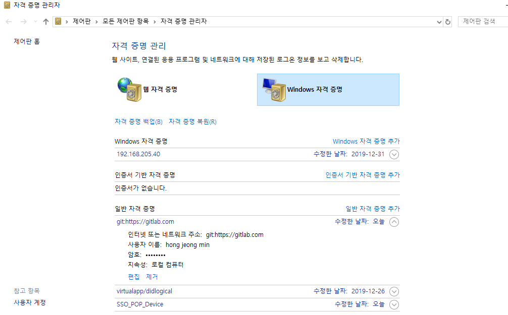 혹시 잘못입력할경우 자격 증명 관리에서 확인해보자.